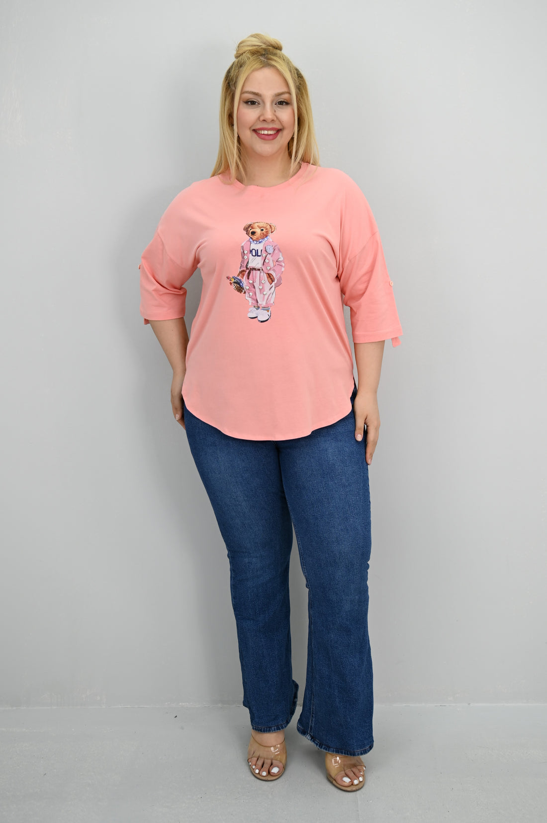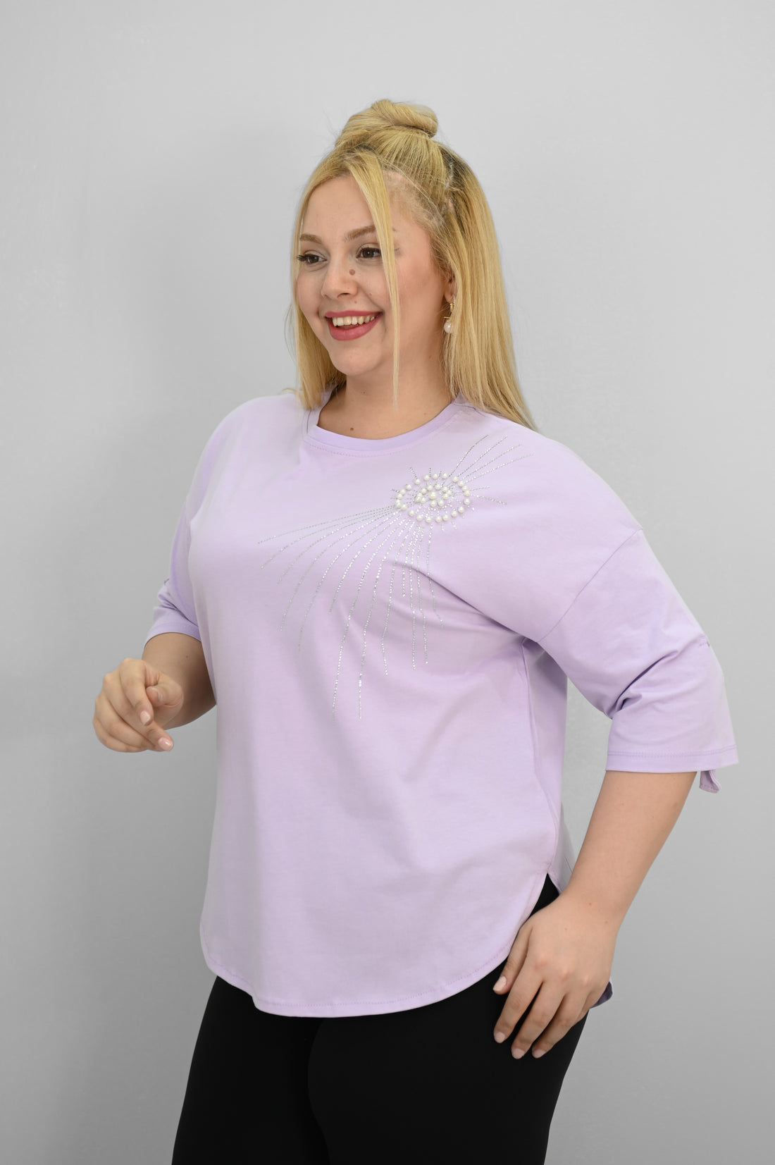 Kadın Büyük Beden Taş İşlemeli Baskı Desenli Oval Kesim Tişört 1927-25