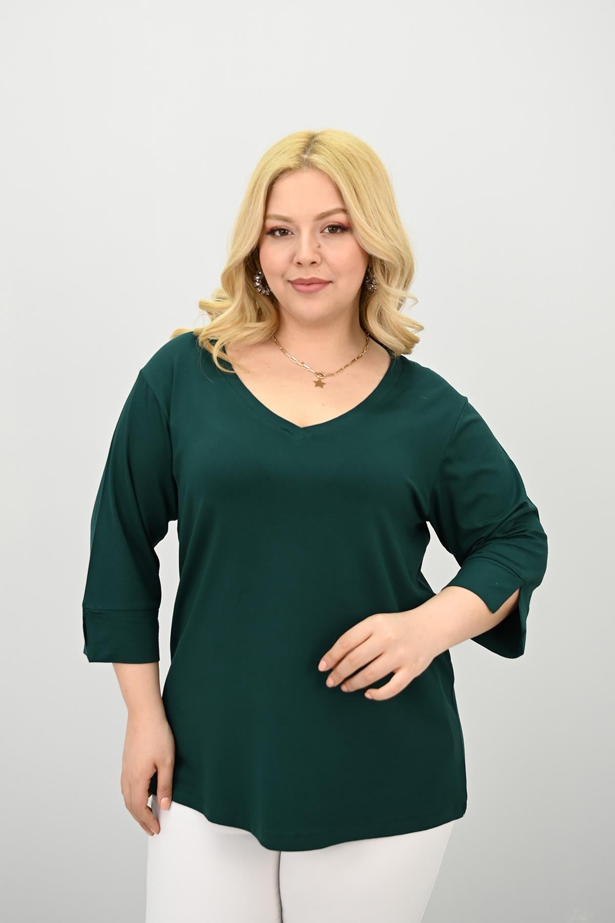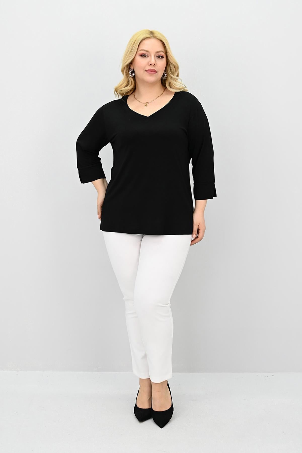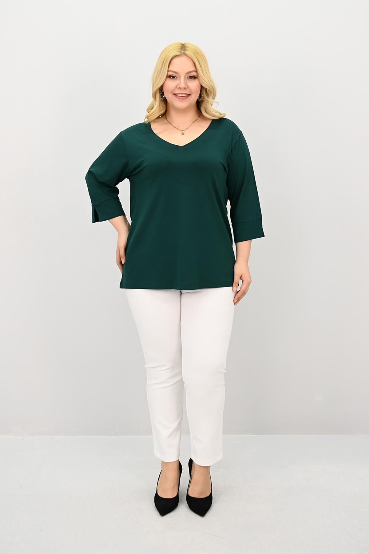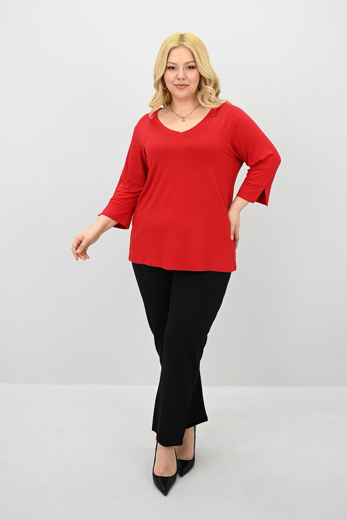Şıklığı ve rahatlığı bir araya getiren bu bluz, 40-50 bedene uyumludur. Günlük kombinlerden şık davetlere kadar geniş bir kullanım alanı sunar. V yaka bantlı model ile modern ve zarif bir duruş sunar. Kol uçlarında yırtmaç detayı sayesinde hareket özgürlüğü sağlar. Rahat kalıp ile vücudu sıkmadan konforlu bir kullanım sunar. Viskon kumaş dokusu sayesinde hafif ve nefes alabilen bir yapıya sahiptir. Manken ’in üzerindeki beden 44 bedendir. (Bedenler arası +/- 2cm fark olmaktadır.) Model Ölçüleri Boy: 1,80 Kilo: 90 Göğüs: 90 Bel: 89 Basen: 116