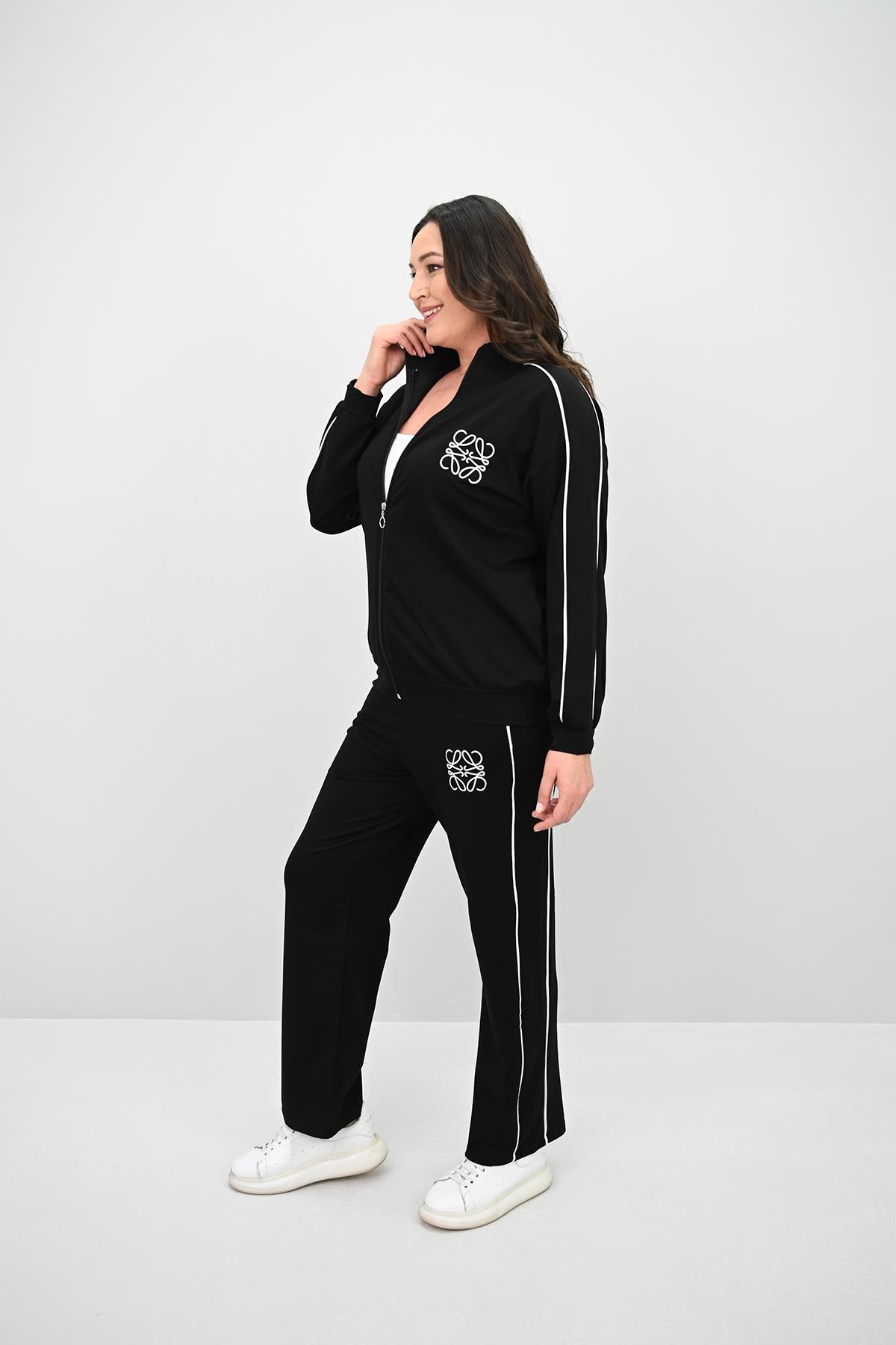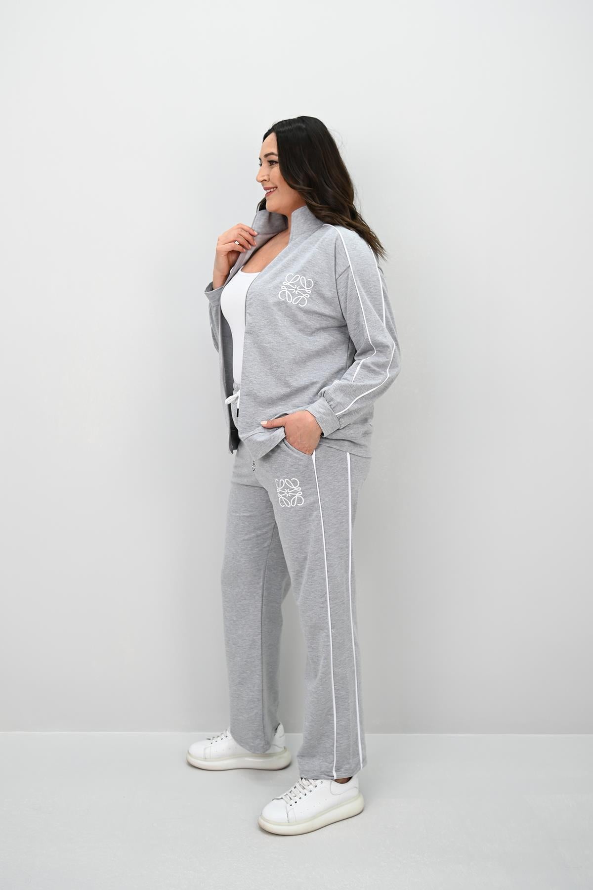 Kadın Büyük Beden Fermuarlı İki İplik İşleme Detaylı Eşofman Takımı, 42-50 bedene uyumludur. Üst kısmı fermuarlı ve dik yakalı olan bu model, göğüs kısmında ve alt parçasında nakış işleme detaylarıyla dikkat çekiyor. Alt kısmı yüksek bel ve bol paçalı tasarıma sahiptir, bu da hareket özgürlüğü sağlarken modern bir görünüm sunar. Yan tarafında ince çizgi şeklinde şerit detay bulunur. 2 iplik kumaştır. Manken ’in üzerindeki beden 44 bedendir. (Bedenler arası +/- 2cm fark olmaktadır.) Model Ölçüleri Boy: 1,80 Kilo: 90 Göğüs: 90 Bel: 89 Basen: 116