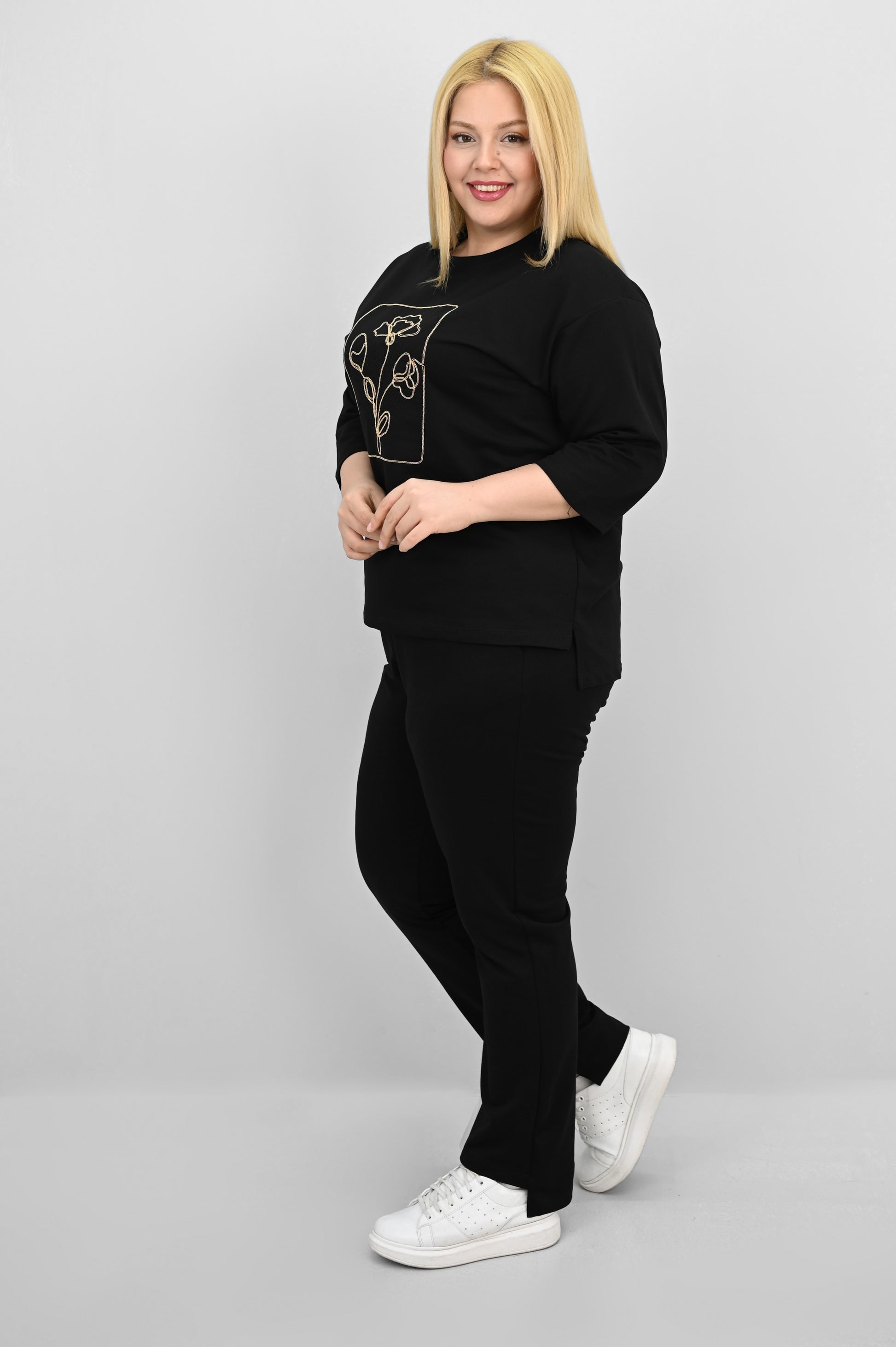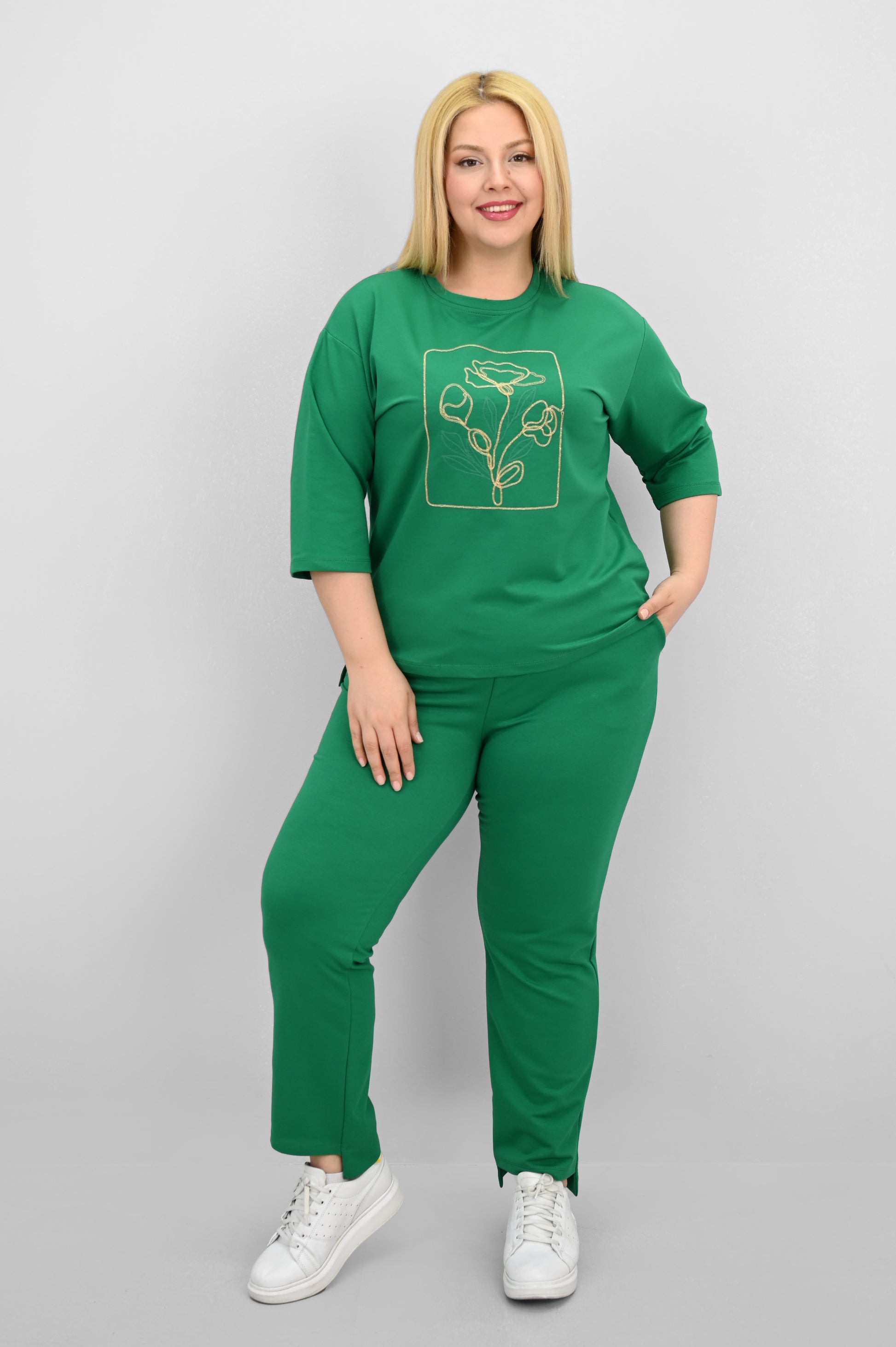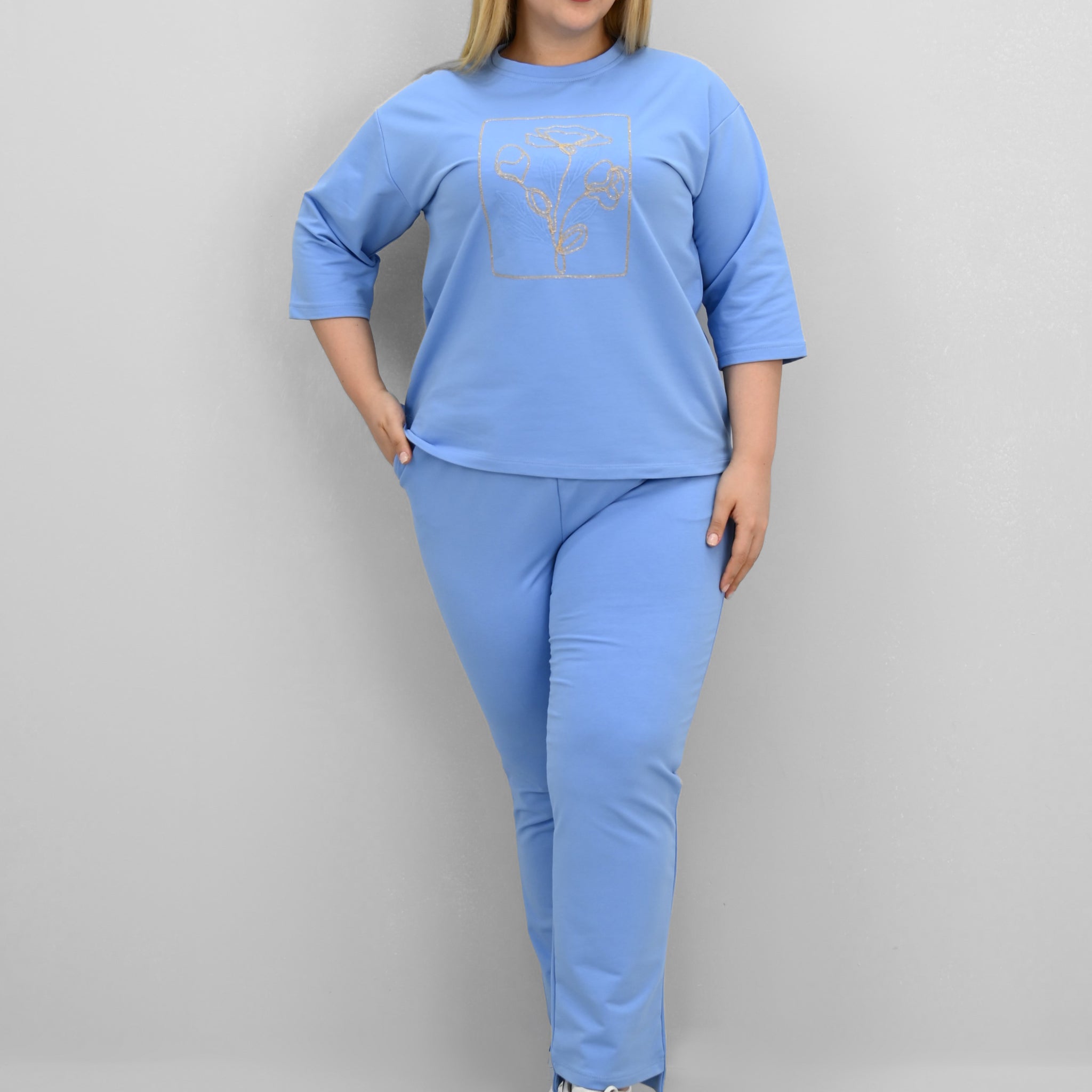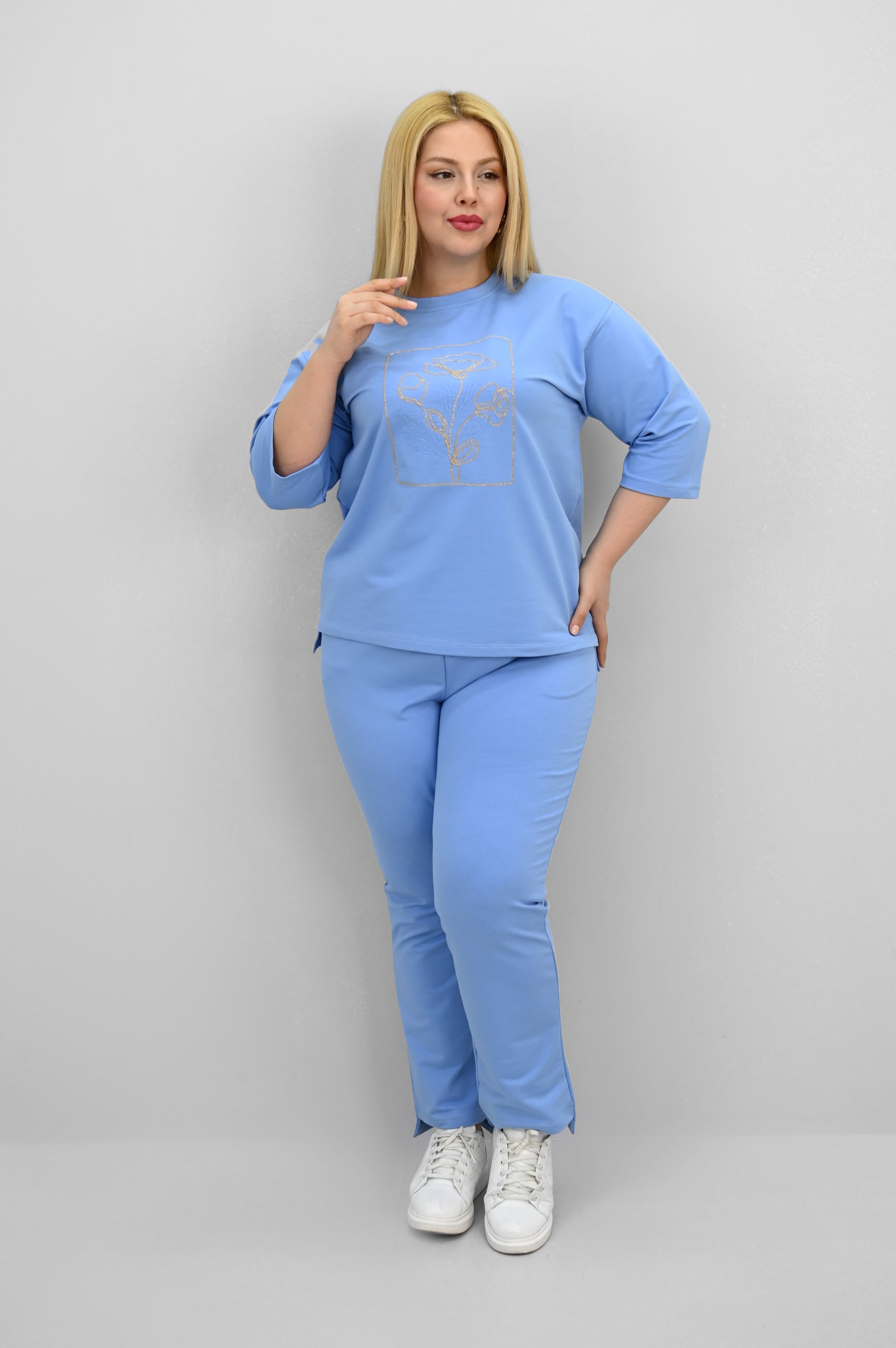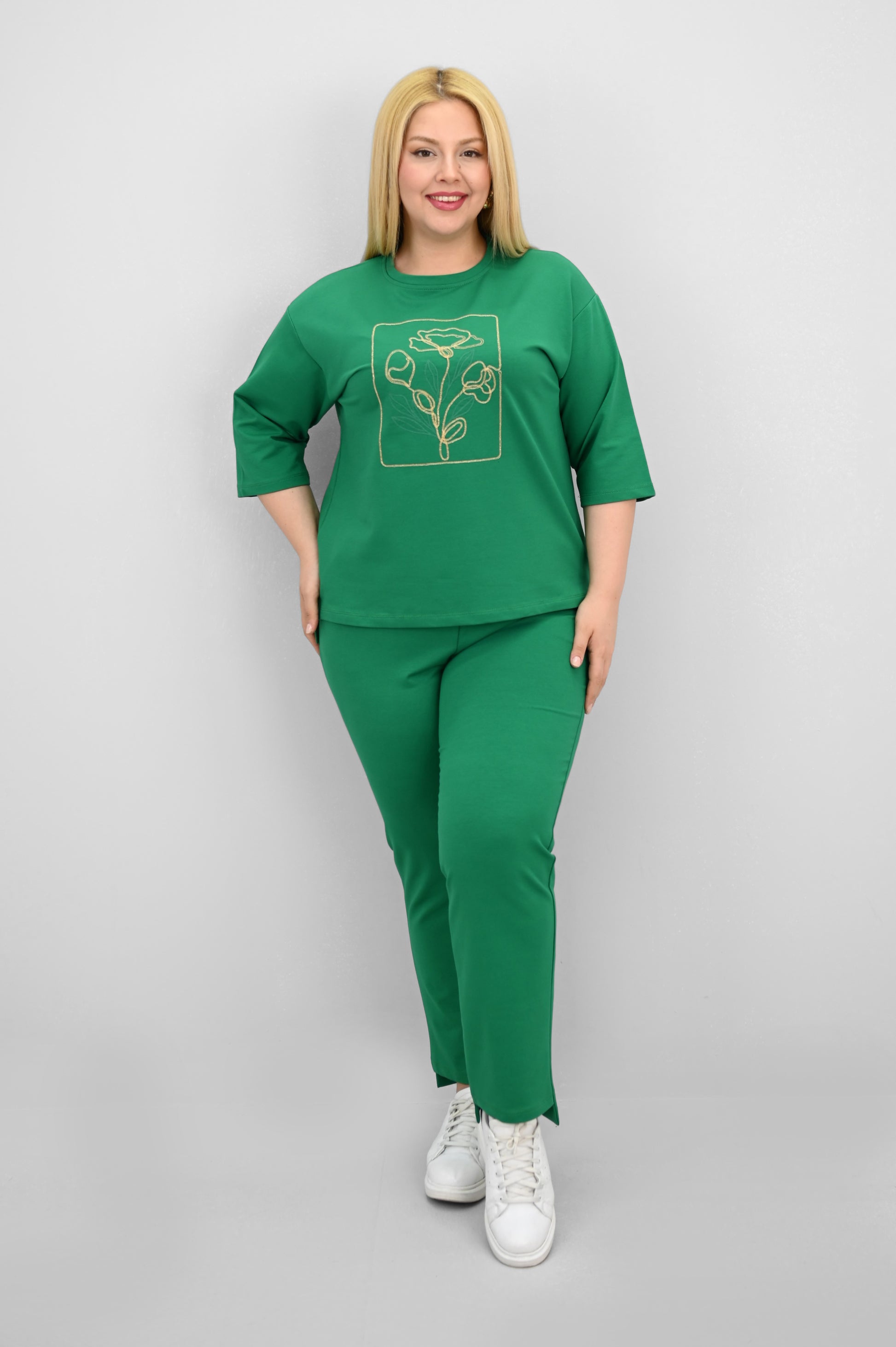 Şıklık ve rahatlığı bir araya getiren bu kadın büyük beden eşofman takımı, 42-50 bedene uyumludur. Üst parçası bisiklet yaka ve kısa kollu tasarımıyla konfor sunarken, ön kısmında yer alan zarif çiçek nakışı detaylarıyla dikkat çekiyor. Hem üst hem de alt parçanın ön ve arka kısımları arasında uzunluk farkı bulunması takıma dinamik bir görünüm kazandırıyor. Alt parça ise yüksek bel, lastikli bel yapısı ve cep detaylarıyla işlevselliği öne çıkarıyor. 2 iplik kumaştan üretilmiş olan takım, hem nefes alabilirliğiyle hem de yumuşak dokusuyla dört mevsim kullanım için idealdir. Manken ’in üzerindeki beden 44 bedendir. (Bedenler arası +/- 2cm fark olmaktadır.) Model Ölçüleri Boy: 1,72 Kilo: 90 Göğüs: 104 Bel: 88 Basen: 115