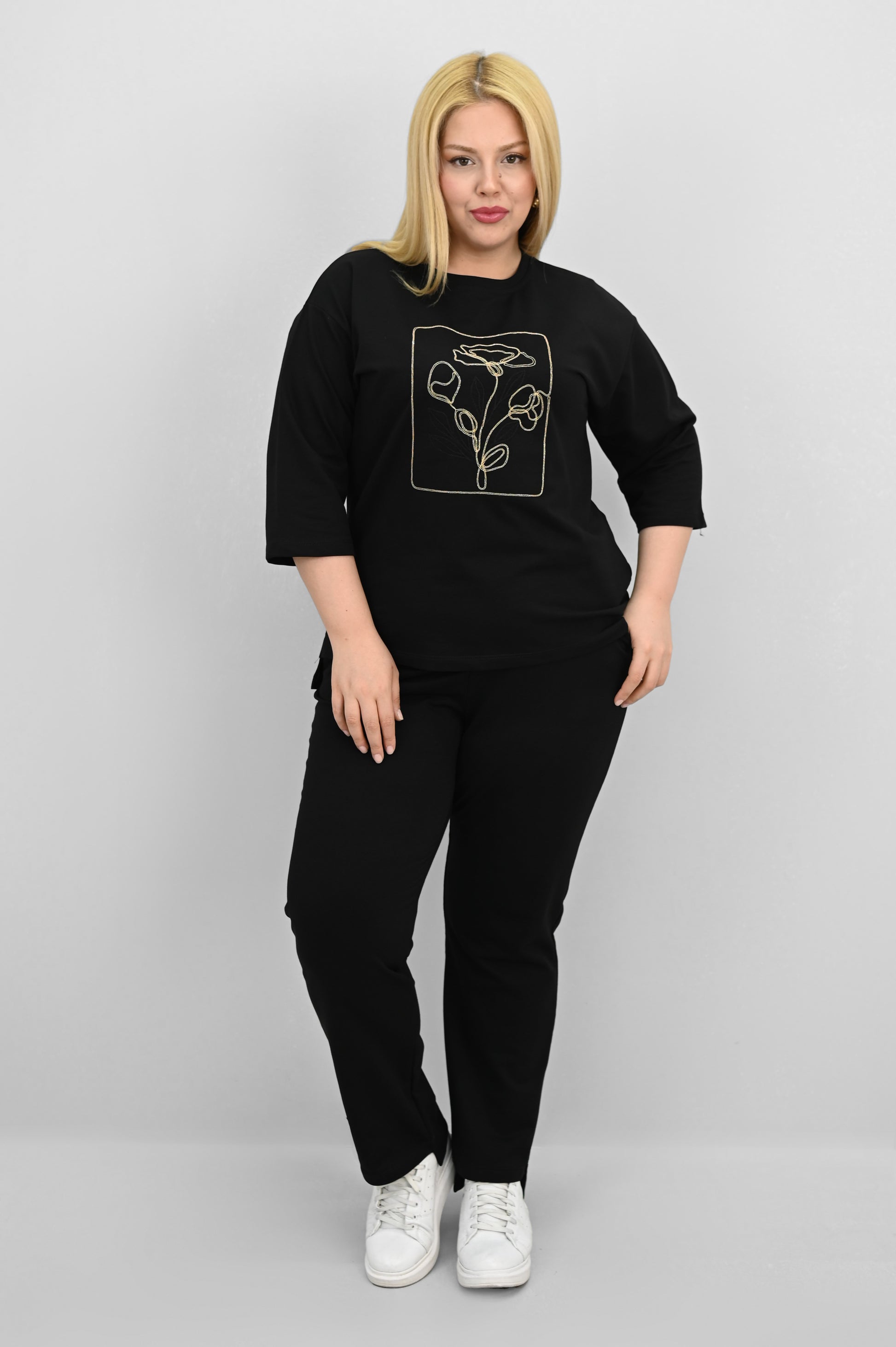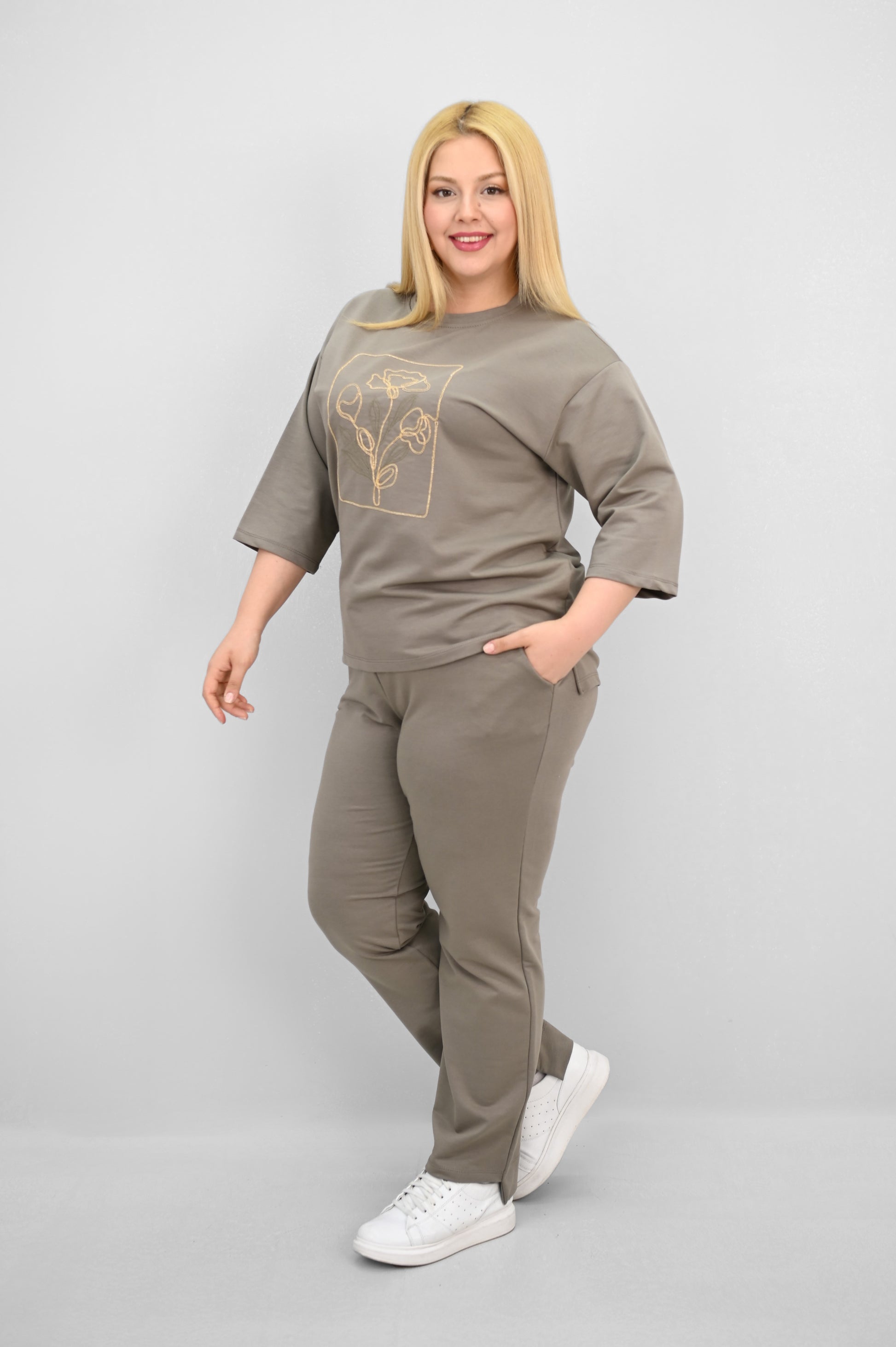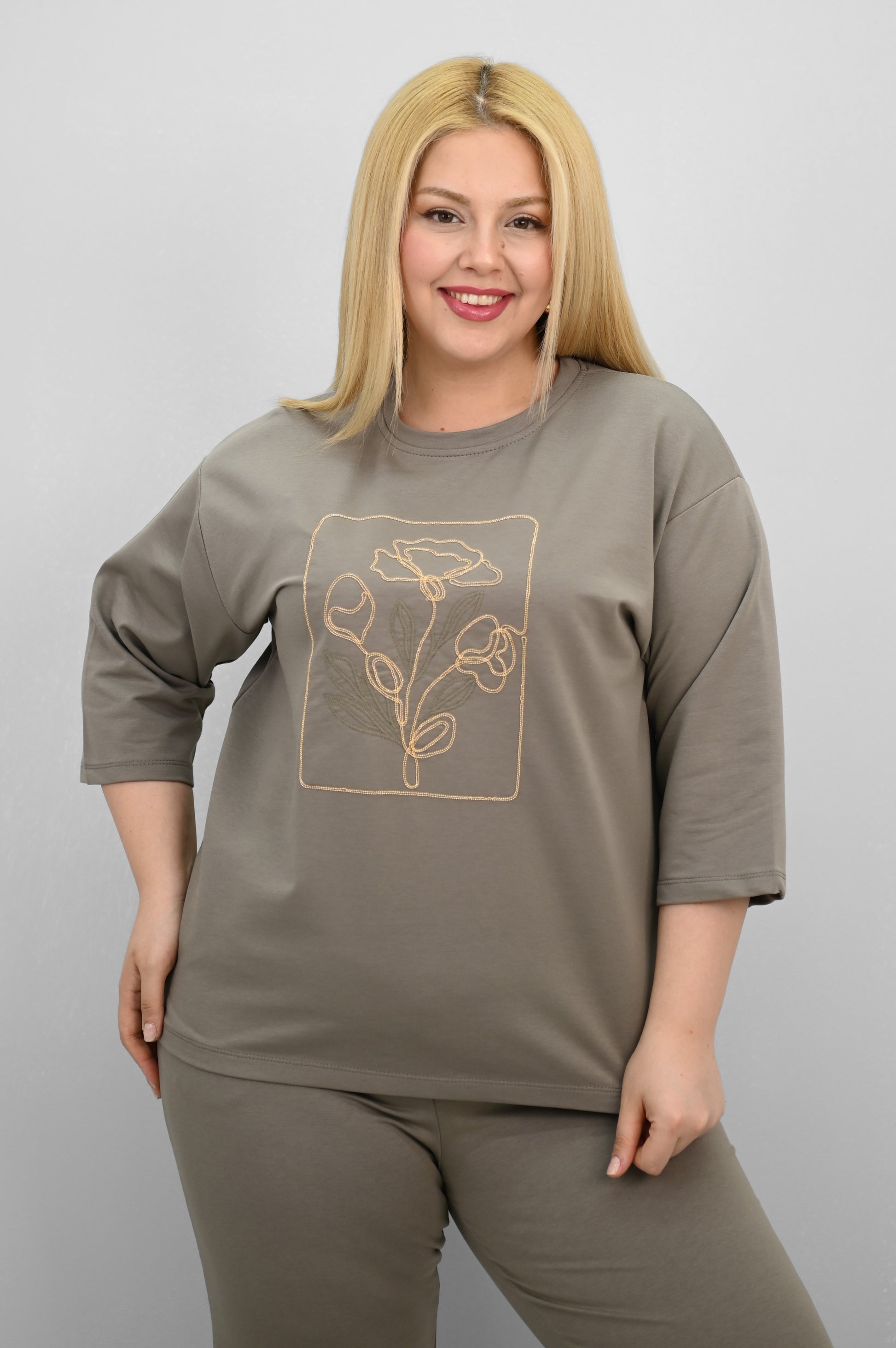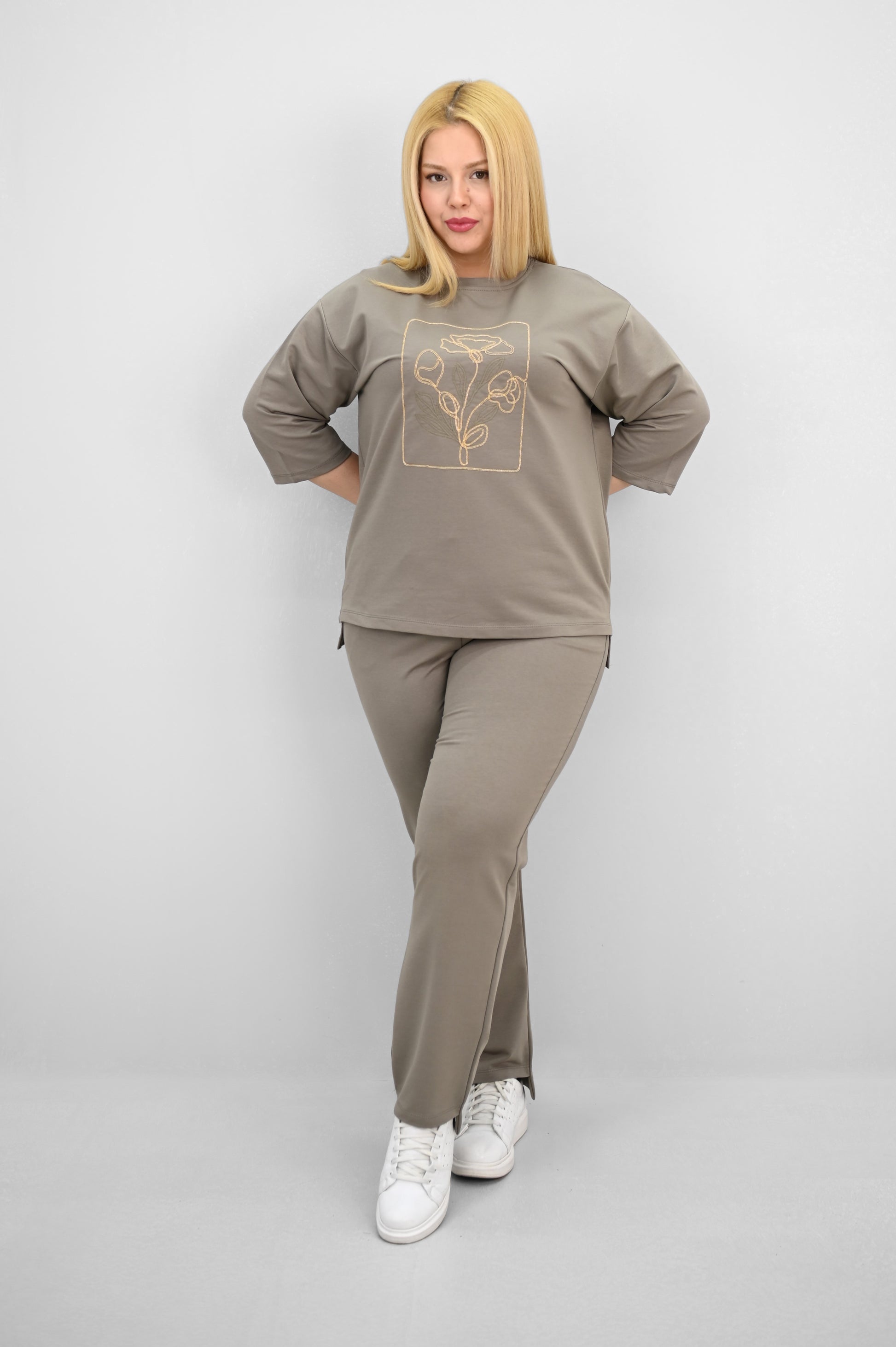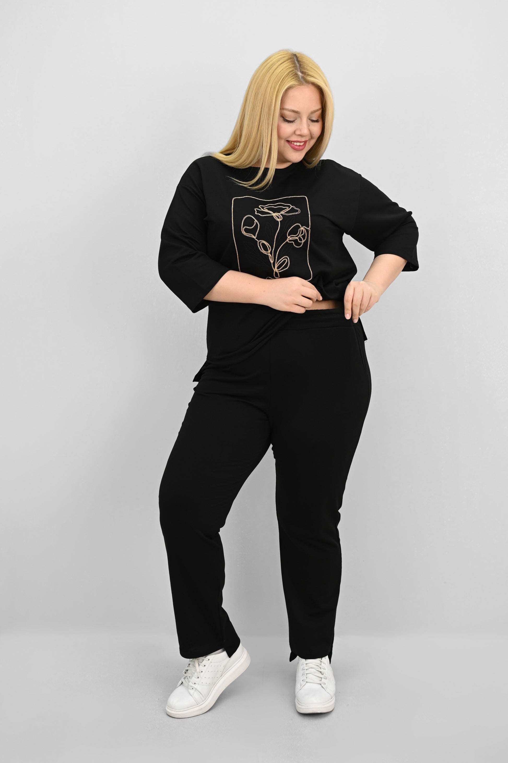 Şıklık ve rahatlığı bir araya getiren bu kadın büyük beden eşofman takımı, 42-50 bedene uyumludur. Üst parçası bisiklet yaka ve kısa kollu tasarımıyla konfor sunarken, ön kısmında yer alan zarif çiçek nakışı detaylarıyla dikkat çekiyor. Hem üst hem de alt parçanın ön ve arka kısımları arasında uzunluk farkı bulunması takıma dinamik bir görünüm kazandırıyor. Alt parça ise yüksek bel, lastikli bel yapısı ve cep detaylarıyla işlevselliği öne çıkarıyor. 2 iplik kumaştan üretilmiş olan takım, hem nefes alabilirliğiyle hem de yumuşak dokusuyla dört mevsim kullanım için idealdir. Manken ’in üzerindeki beden 44 bedendir. (Bedenler arası +/- 2cm fark olmaktadır.) Model Ölçüleri Boy: 1,72 Kilo: 90 Göğüs: 104 Bel: 88 Basen: 115