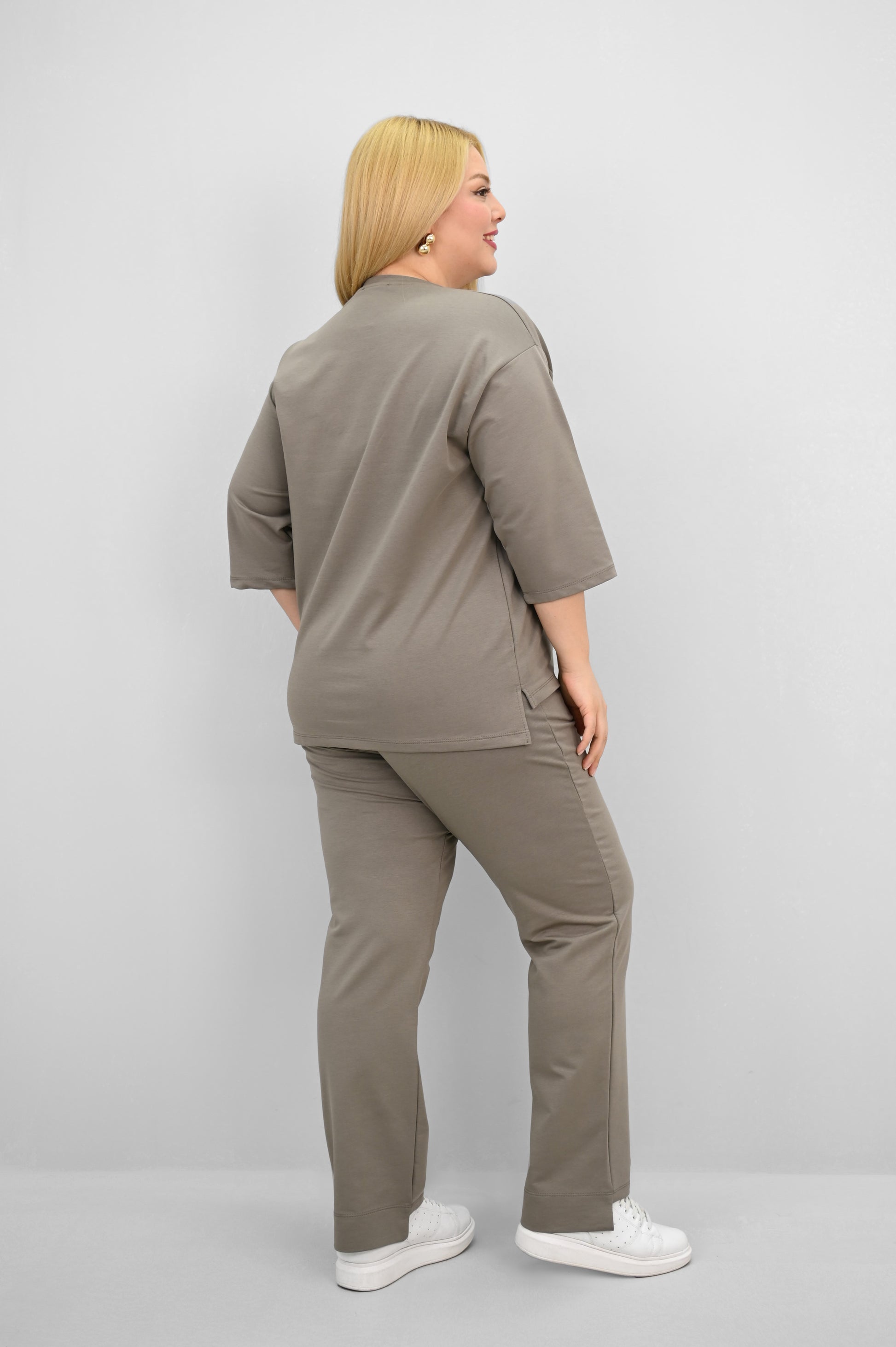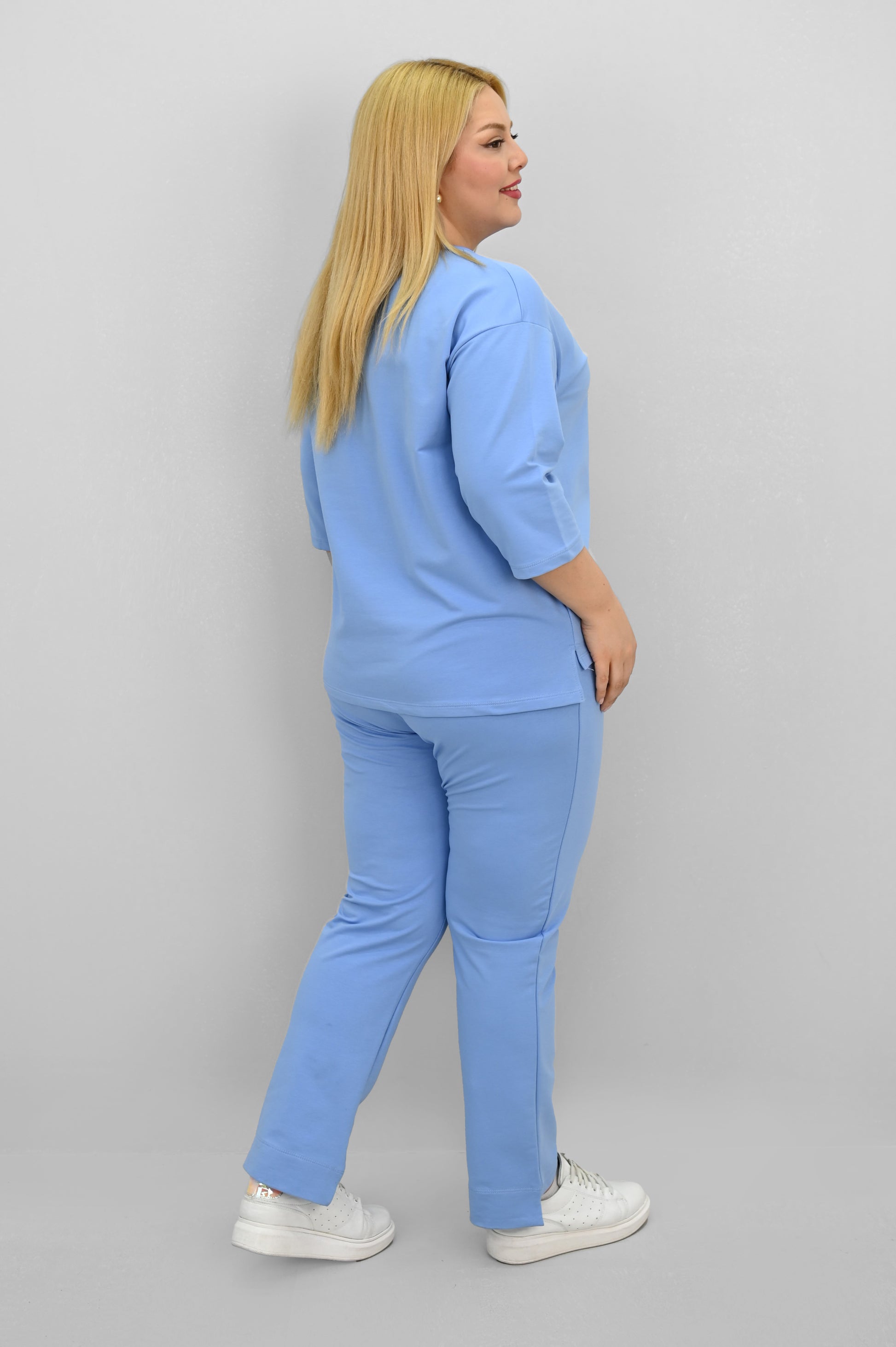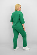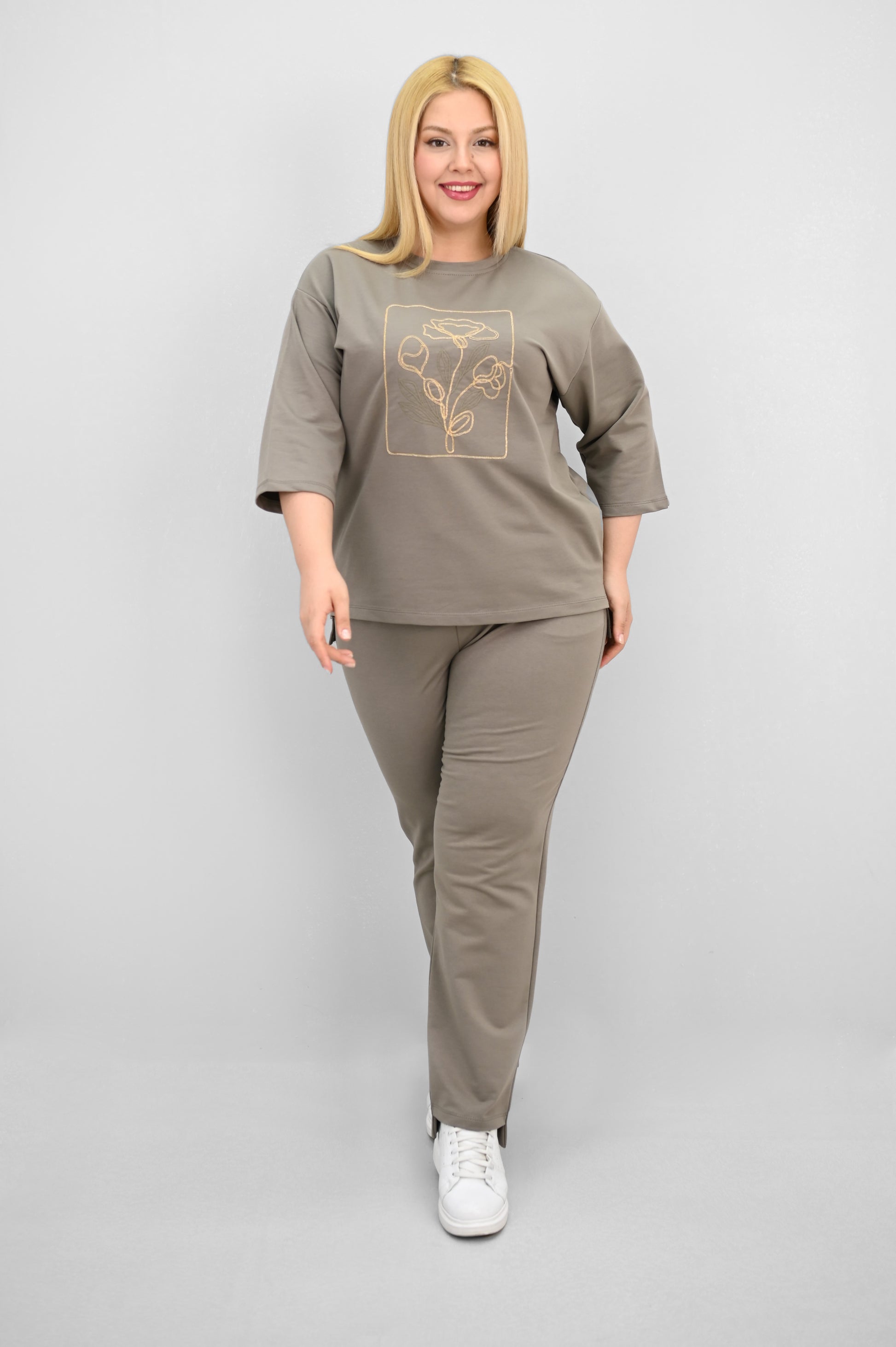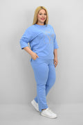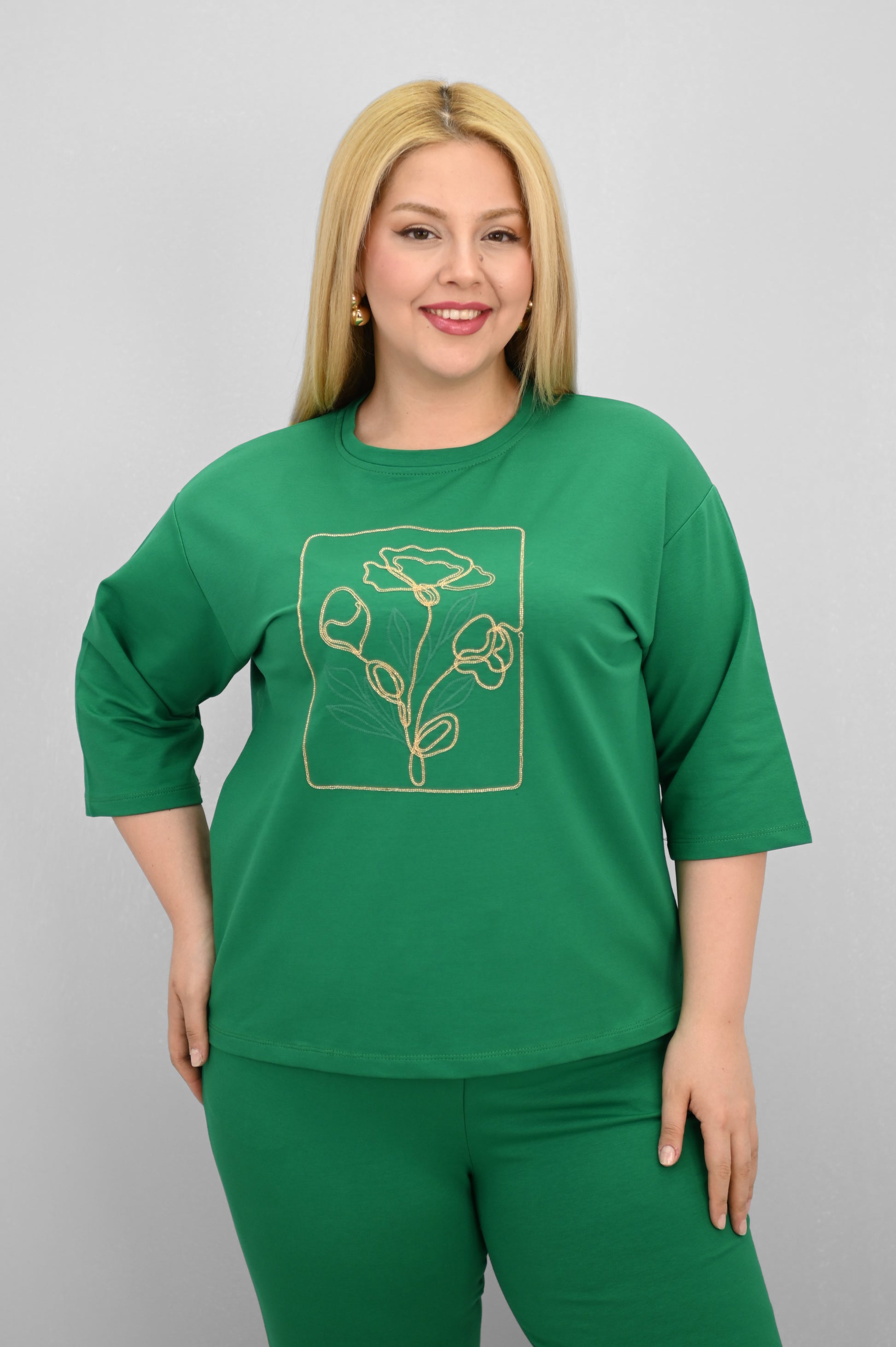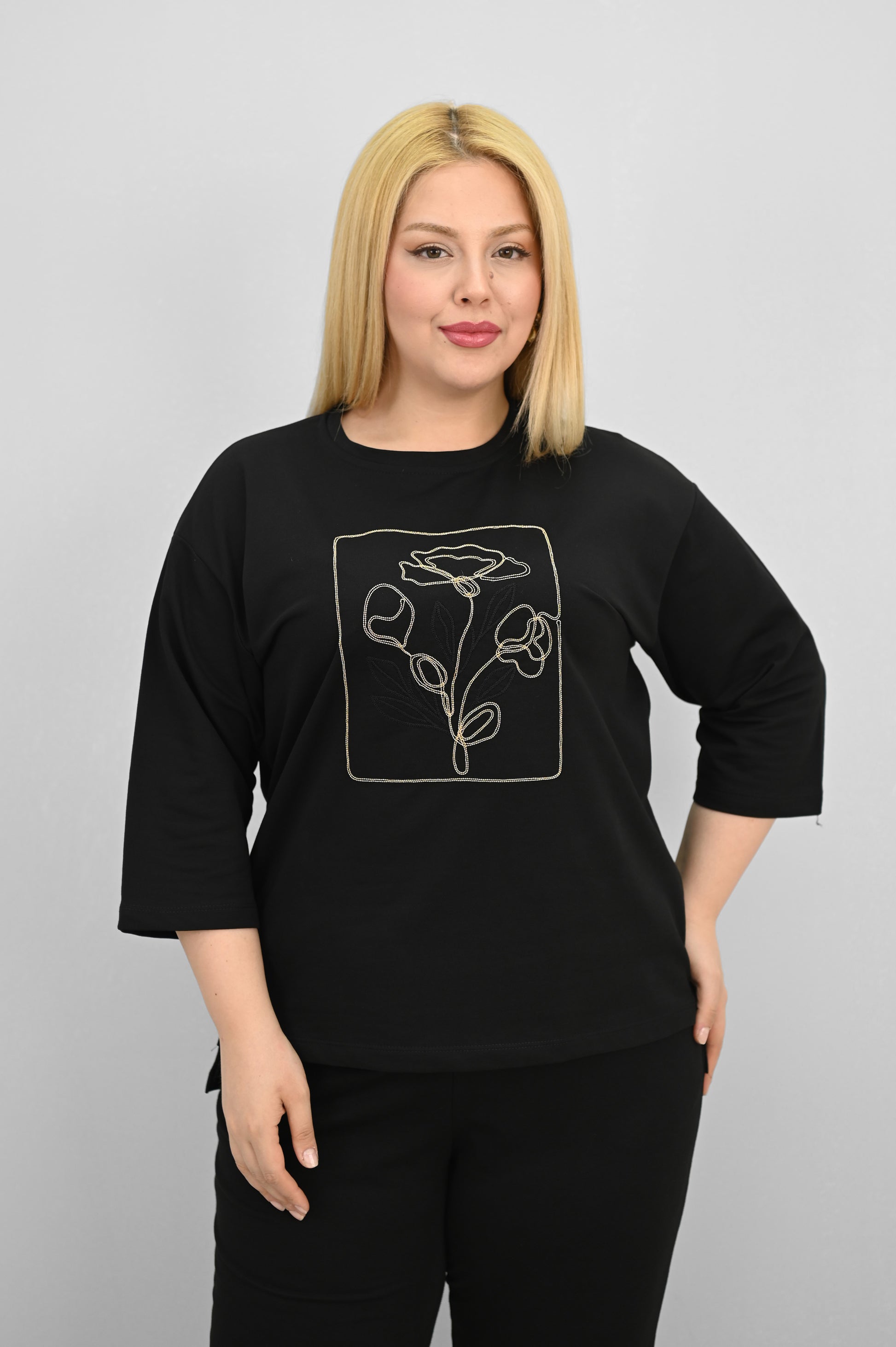 Şıklık ve rahatlığı bir araya getiren bu kadın büyük beden eşofman takımı, 42-50 bedene uyumludur. Üst parçası bisiklet yaka ve kısa kollu tasarımıyla konfor sunarken, ön kısmında yer alan zarif çiçek nakışı detaylarıyla dikkat çekiyor. Hem üst hem de alt parçanın ön ve arka kısımları arasında uzunluk farkı bulunması takıma dinamik bir görünüm kazandırıyor. Alt parça ise yüksek bel, lastikli bel yapısı ve cep detaylarıyla işlevselliği öne çıkarıyor. 2 iplik kumaştan üretilmiş olan takım, hem nefes alabilirliğiyle hem de yumuşak dokusuyla dört mevsim kullanım için idealdir. Manken ’in üzerindeki beden 44 bedendir. (Bedenler arası +/- 2cm fark olmaktadır.) Model Ölçüleri Boy: 1,72 Kilo: 90 Göğüs: 104 Bel: 88 Basen: 115