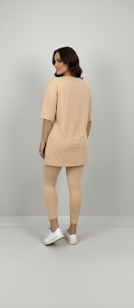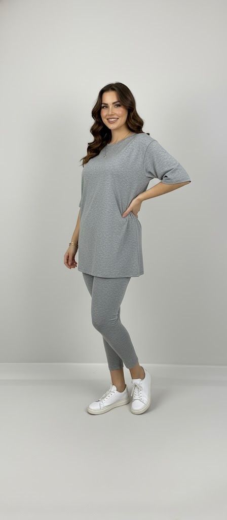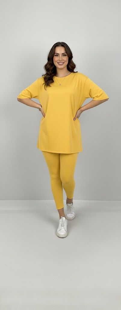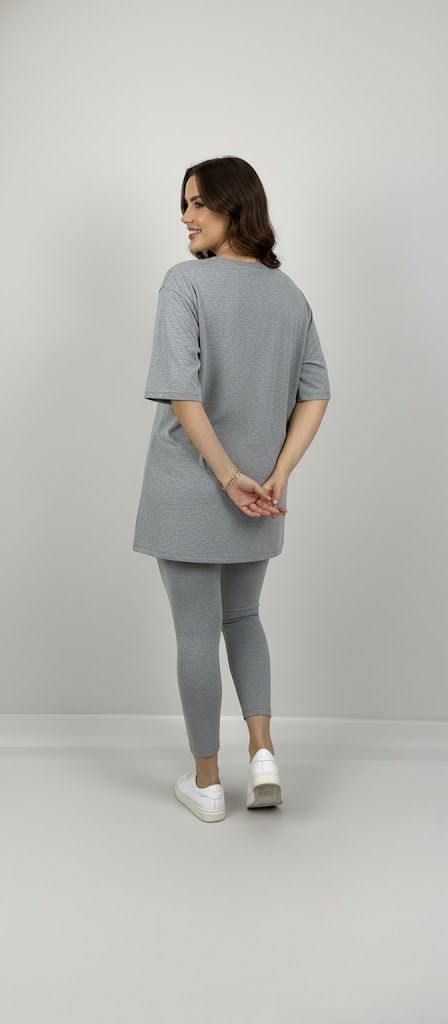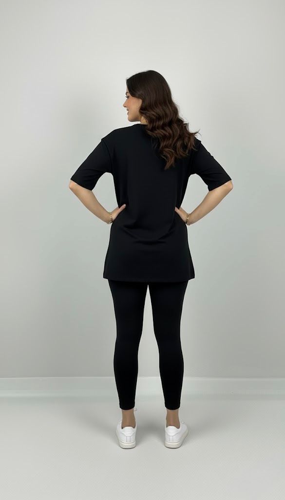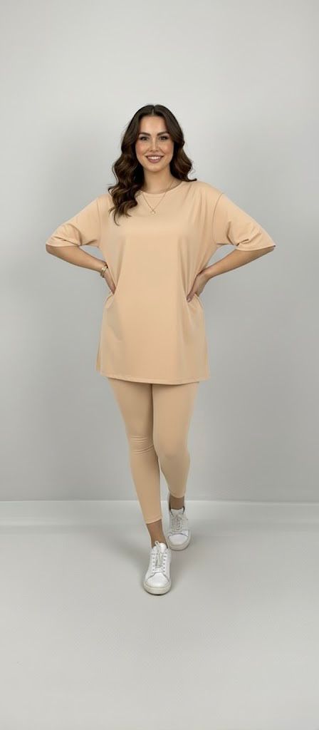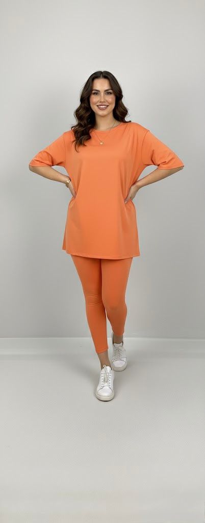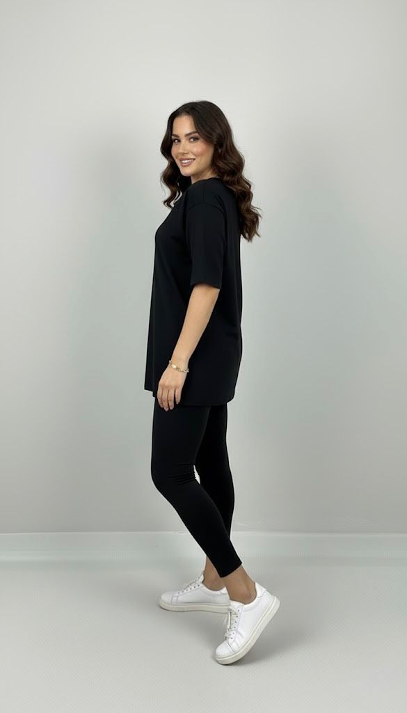 Kadın büyük beden tayt takımı, 42-52 bedene uyumludur. Üst parça kısa kollu ve bisiklet yaka modeldir. Oversize kesimi sayesinde ferah bir kullanım sunarken, tişört uzunluğu baseni kapatacak şekilde tasarlanmıştır. Alt parça ise yüksek bel tayt olup, vücuda tam oturur ve hareket özgürlüğü sağlar. Esnek yapısıyla gün boyu konfor sunan likralı süprem kumaştan üretilmiştir. Manken ’in üzerindeki beden 44 bedendir. (Bedenler arası +/- 2cm fark olmaktadır.) Model Ölçüleri Boy: 1,72 Kilo: 90 Göğüs: 104 Bel: 88 Basen: 115