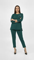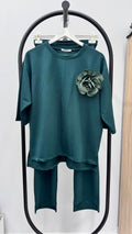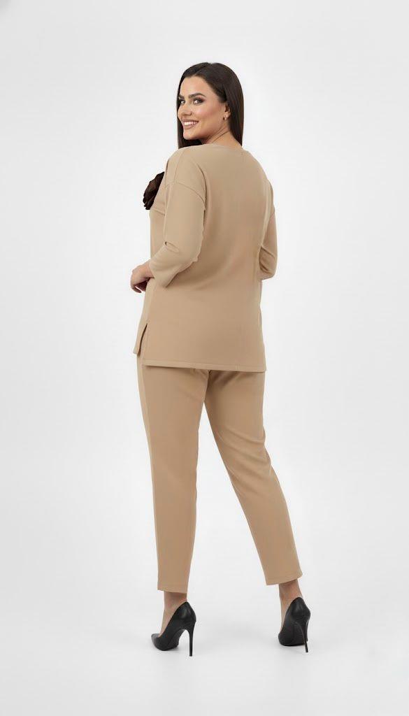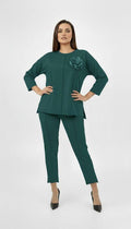 Zarif detaylarıyla dikkat çeken bu kadın büyük beden eşofman takımı, 42-50 bedene uyumludur. Üst kısmı önü kısa arkası uzun formdadır ve modern bir duruş kazandırır. Göğüs kısmında yer alan iğneli takıp çıkarılabilir çiçek detayı, takı kullanmadan bile şıklığı tamamlar. Truvakar kol tasarımıyla mevsim geçişlerinde konfor sağlar. Alt kısmı beli lastikli, bol paça ve cepli olup, paça detayı önü kısa arkası uzun kesimle tamamlanmıştır. 2 iplik kumaş yapısı sayesinde yumuşak, esnek ve nefes alabilen bir doku sunar. Manken ’in üzerindeki beden 44 bedendir. (Bedenler arası +/- 2cm fark olmaktadır.) Model Ölçüleri Boy: 1,72 Kilo: 90 Göğüs: 104 Bel: 88 Basen: 115